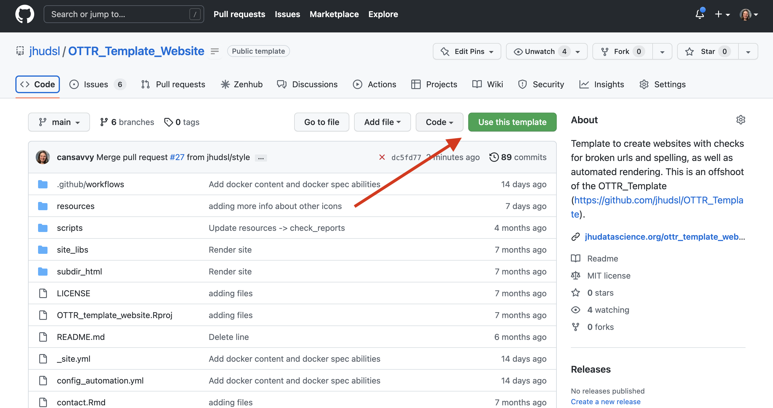 Create your repository by clicking on the Use this Template button at OTTR_Template_Website repository